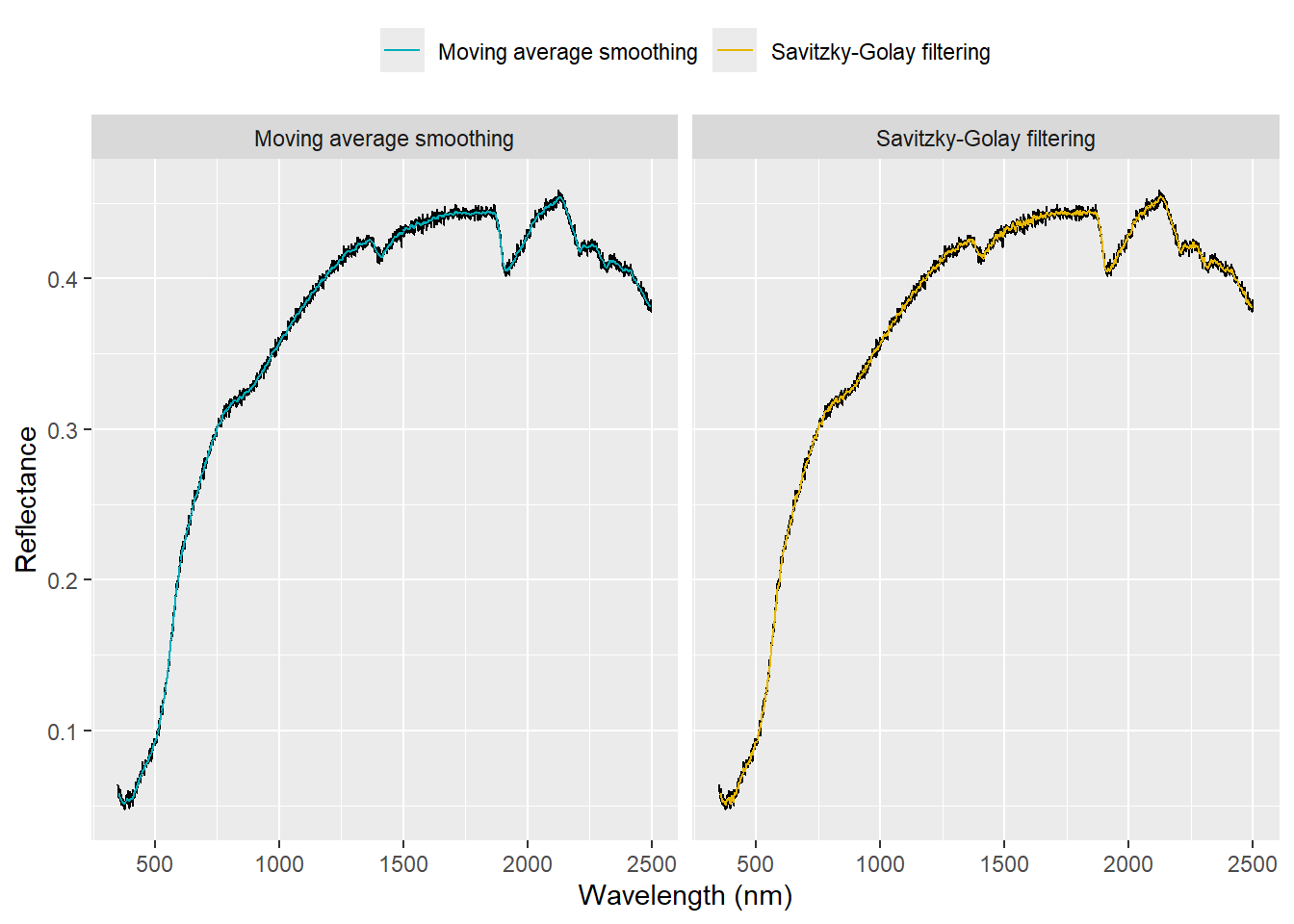load("C:/BLOG/Workspaces/NIR Soil Tutorial/post4.RData")We have seen in the previous post how to remove artifacts in the spectra using the spliceCorrection function from the prospectr package. But there are other sources of noise in the spectra which depends of several factors, as the quality of the spectrophotometer (can use a signal to noise ratio meassurement to test it), the scanning time, resolution, sample presentation, …. In this post we continue with the “course on applied data analytics for soil analysis with infrared spectroscopy” using the reference material provided. And this time we are going to see the part of the course where we add noise to the spectra and then we apply two methods to remove it. The methods are the Moving Window Average and the Savitzky-Golay Filter.
